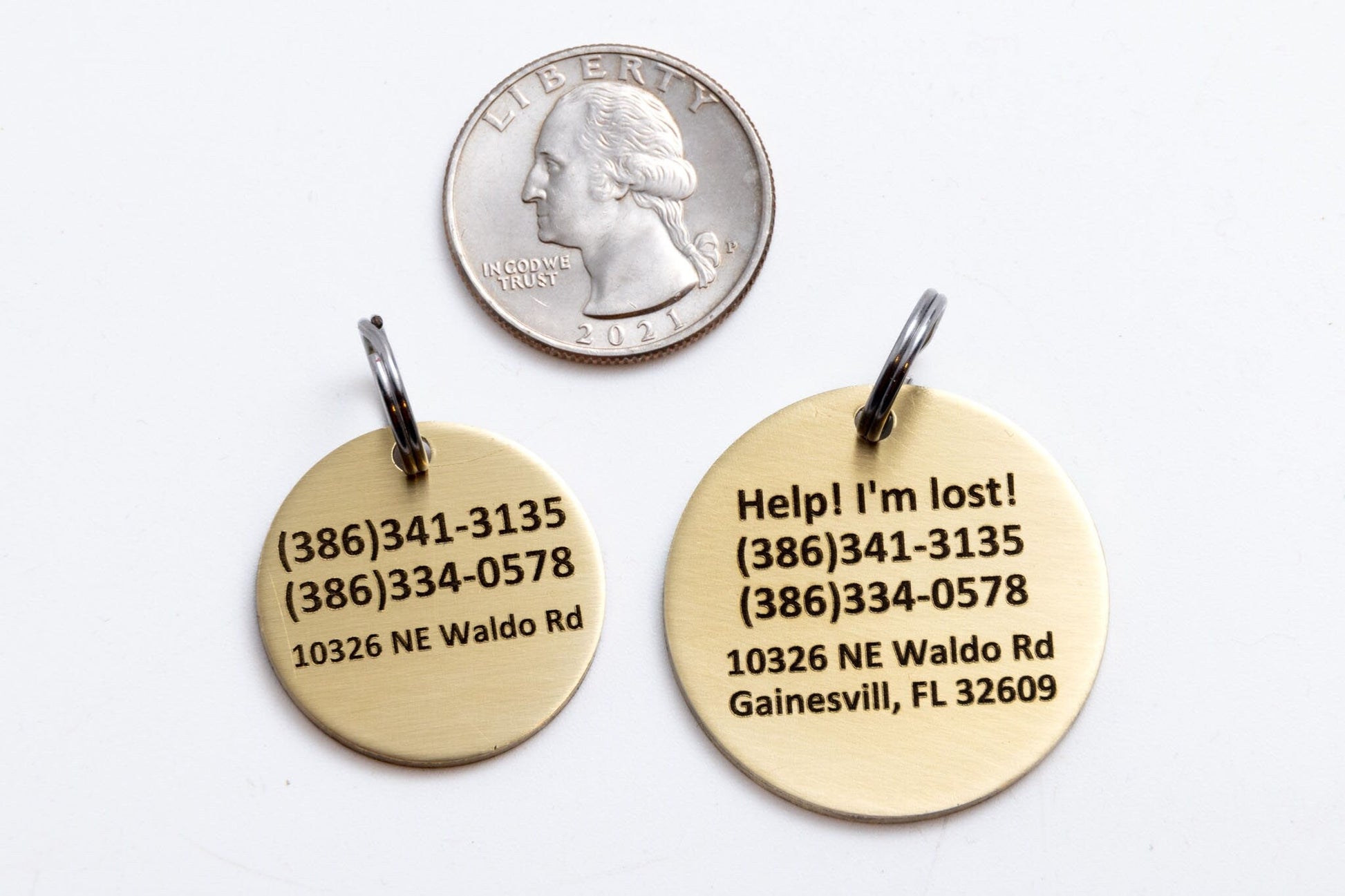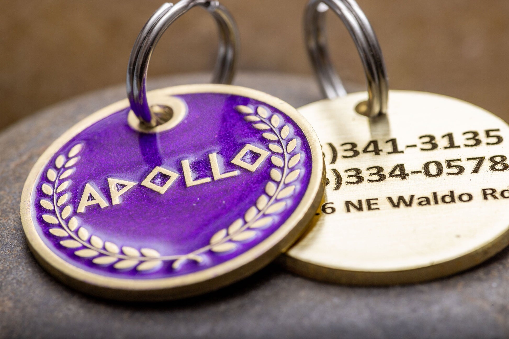 This ID tag comes customized with your pet's name and information. It is made brass, which has a gold color. These tags are individually configured to ensure your pet's name is placed beautifully within the design. That said, expect some minor variance from what's pictured in the listing images. We hand-apply glossy purple enamel to create a highly durable product with color that won't rub off.