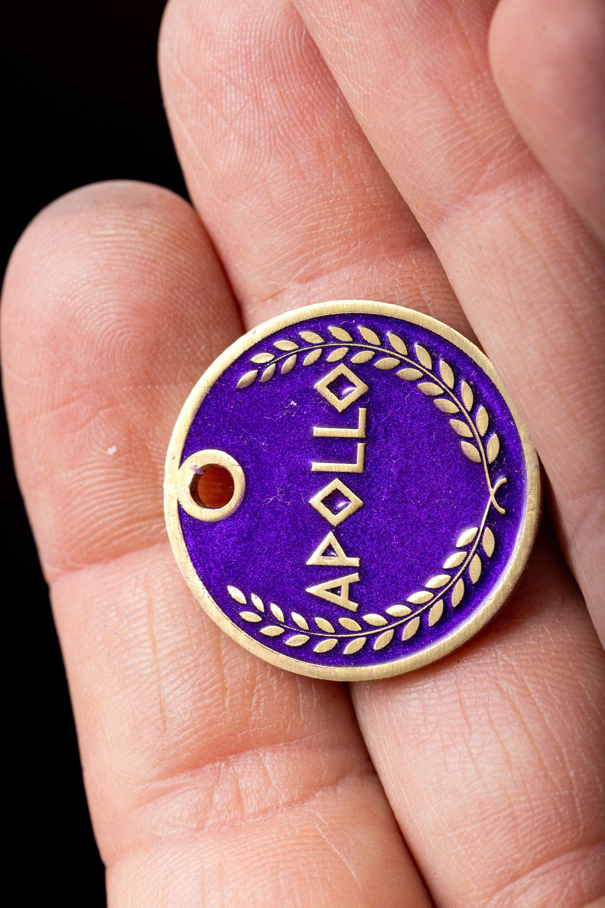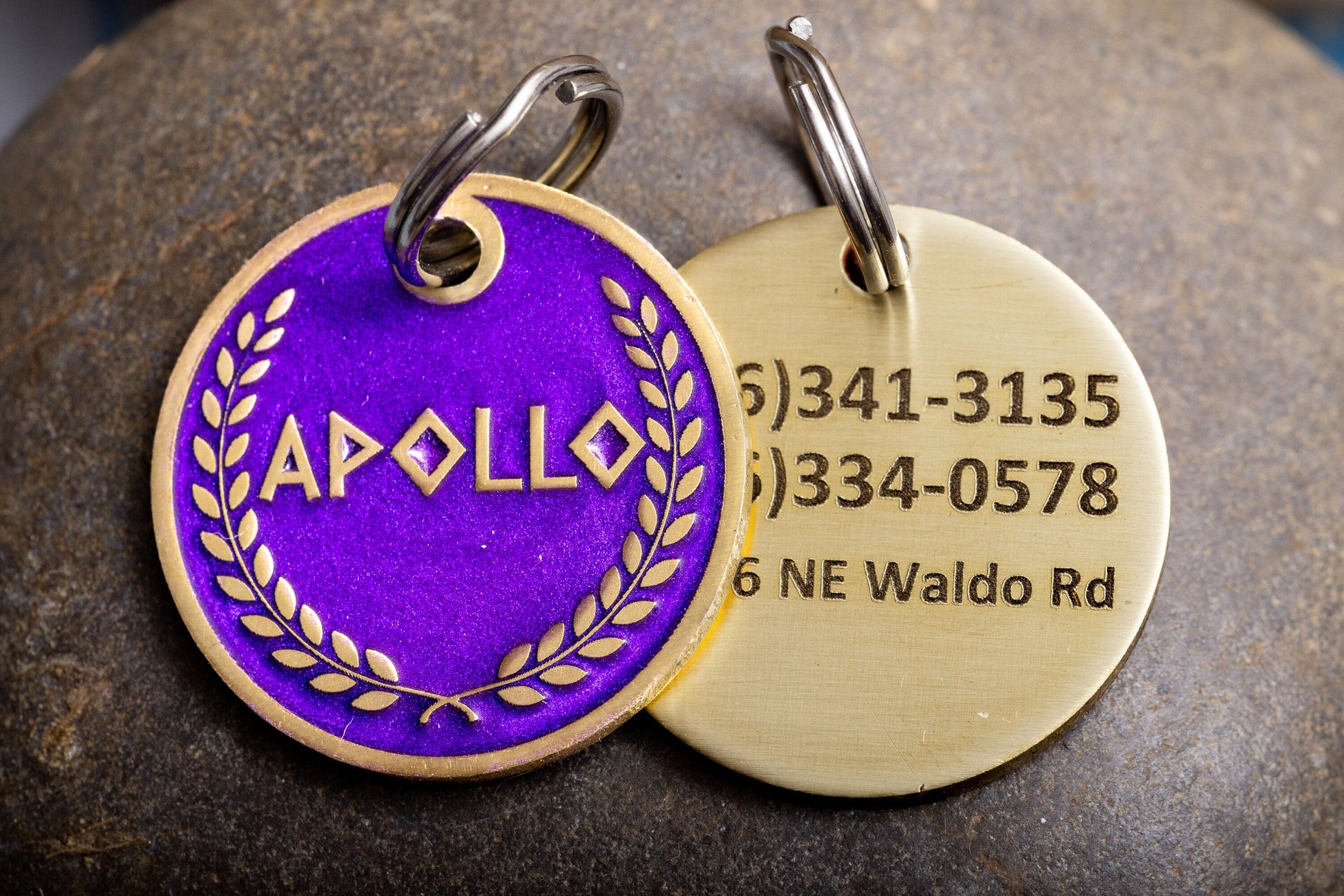 Engraved Greek Laurel Pet ID Tag - Cat or Dog Royal Purple and Gold Name Tag - Greek God Pet ID Tag